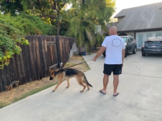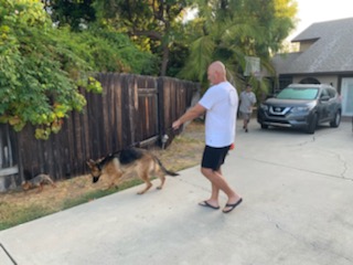 So this is trainer Chris. Chris is a former Marine K9 handler and loves GSDs. Mookie gave Chris no trouble while I was watching, but Mookie pushed back when my back was turned.