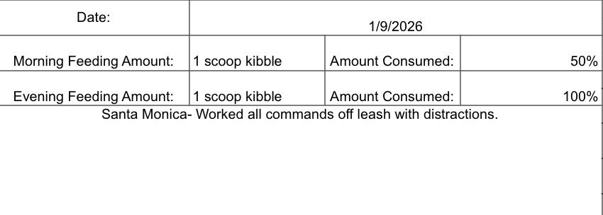 Xavier performed most of his commands just as expected. The main areas weāll continue tightening up are his heel and recall, both of which are especially important if we want to safely give him the freedom of being off leash. All in all, despite a few early hiccups and Xavier deciding that listening wasnāt the vibe at first, we still made solid progress today. Off days happenāeven for dogsāand Iām confident tomorrow will be an even better day!